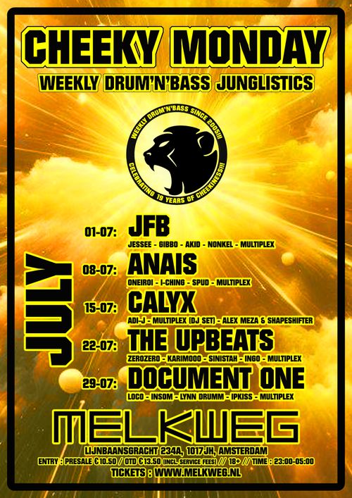 All junglists and drum'n'bass crew gather! Every week the infamous Cheeky Monday massive returns to Melkweg for the regular Monday night tradition. Always a thick line-up!