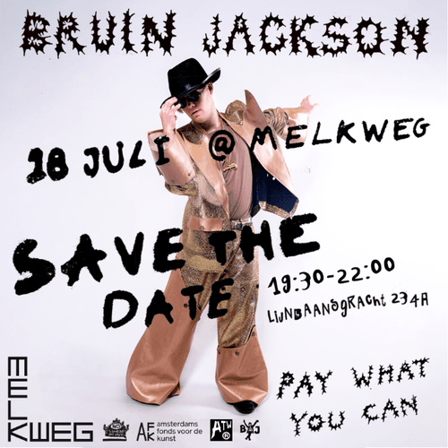 With a quirky sound and unpredictable moves, Bruin Jackson - alter ego of multidisciplinary artist Bruin Parry - is ready to take the world by storm! Get ready for an unforgettable evening, where Bruin will present his debut album, “Cowboy van de Jordaan'. His music is a unique blend of styles, marked by a hefty dose of autotune and lyrics ranging from Bassie and Adriaan to sexy ladies and his beloved grandmother. During the live show you will be taken into a world without borders, with different acts, video clips and above all: a big party.