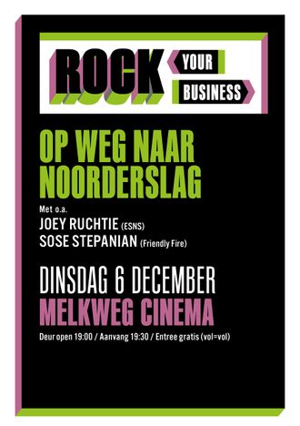 In Rock Your Business - Op weg naar Noorderslag vertellen onze panelleden je alles over hoe je dit voor elkaar krijgt. Is er een specifieke route die je moet volgen om op Noorderslag te staan? Heb je een boeker of manager nodig? En wat nou als het je niet lukt om daar te staan, wat kan je dan het beste doen? In het panel zitten o.a. Noorderslag programmeur Joey Ruchtie en boeker Sose Stepanian (Friendly Fire).