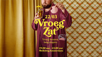 VroegZat is back at Melkweg in 2024 for another dance! The name VroegZat is a wordplay in Dutch we won't translate, but their goal is to bring nightlife back to the early evening. Pub style. So expect some next level partying and going to bed at a normal time so you can be fit the next day. A win-win for everyone. Perfect for those in their thirties and forties who have kids by their bedside the next morning, but also for anyone who sometimes just feels so old.