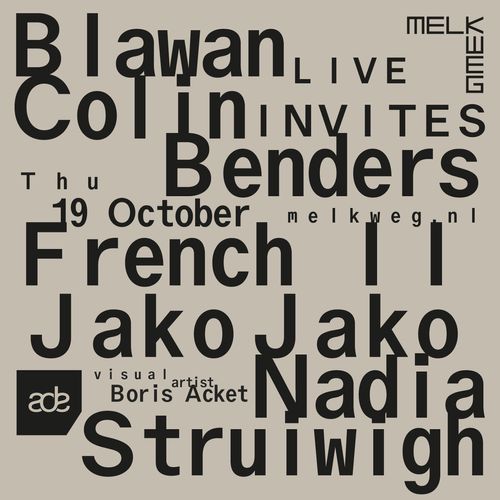 Sinds hij zichzelf opnieuw heeft uitgevonden als live-performer met modulaire synthesizers en elektronische instrumenten, is het muzikale universum van Utrechter Colin Benders exponentieel gegroeid. Na de ambitieuze en succesvolle Etmaal weekender in TivoliVredenburg afgelopen februari, zal Benders op de donderdag van Amsterdam Dance Event een gloednieuwe clubnacht cureren in de Rabozaal van Melkweg. Dezelfde zaal waar hij samen speelde met het Metropole Orkest tijdens het indrukwekkende openingsconcert van ADE 2018, en dezelfde zaal als de audiovisuele show met Boris Acket tijdens ADE 2019. Colin Benders Invites bouwt hierop voort met een eigen en divers technogeluid - van vederlichte pads tot dreunende kicks, experimentele polyritmes en nieuwe zintuigprikkelende visuals van Boris Acket.