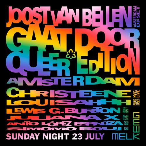 Op zondag 23 juli, de bloedhete avond en nacht van het openingsweekend van Queer Pride, zet Joost van Bellen de bloemetjes binnen in de club. Dat zijn er veel en in alle mogelijke kleuren. Van Bellen draait rug-aan-rug met Juliana X van queerclub Zuperstition uit Rotterdam. Superster en vuige dragterrorist Christeene vliegt op haar bezemsteel over uit New York City voor een exclusief optreden. Industrial techno & punkraver Louisahhh is een van de coolste dj's op aarde en komt vanuit Parijs voor een knalset. Lewis G. Burton, mede-oprichter van het beruchte Inferno uit Londen, sloopt de boel en sluit daarmee deze nu al legendarische nacht af. En dat is niet alles: twee vermaarde nachtdieren en kunstenaars doen hun prachtige duit in het zakje. De Spaanse Anto López Espinosa én de Vlaams-Marokkaanse Simomo Bouj zetten beiden een kunstperformance van hoog niveau neer. We raden je aan om een groot kruis door je plannen van de maandag zetten!