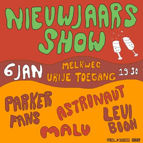 Het nieuwe jaar inluiden met nieuwe muziek? Melkweg en GRAP presenteren de Nieuwjaarsshow 2024! Op zaterdag 6 januari luiden we traditiegetrouw het nieuwe jaar in met een nieuwjaarsrede en optredens van opkomende Nederlandse acts. Op het programma staan Dorpsstraat 3, Parker Fans, Malu, Levi Boon en Astronaut. Proost met ons op een nieuw jaar gevuld met alleen maar meer nieuwe muziek, geweldige shows en te gekke artiesten!