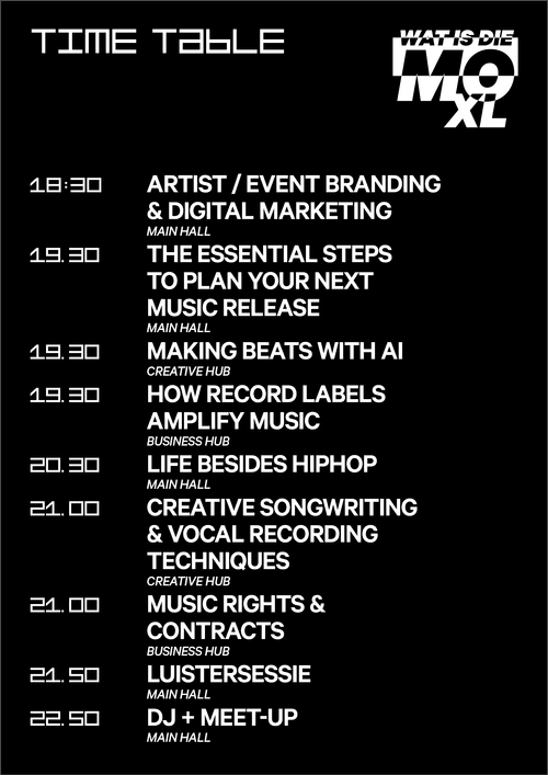Geef je muziekcarrière een boost en laat je inspireren door onze industry friends. Ontdek de nieuwste trends en ontwikkelingen, en verken samenwerkingsmogelijkheden met gelijkgestemden. Of je nu een opkomende artiest bent die op zoek is naar je doorbraak of een getalenteerde producer die je ambities wil verwezenlijken. Wat is die MO XL biedt kansen om je netwerk uit te breiden en waardevolle contacten te leggen binnen de branche.