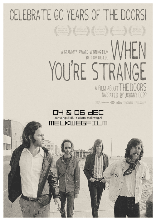 In 1965, vijf jaar voordat de Melkweg werd opgericht, ontstond de band The Doors. Deze documentaire vertelt het verhaal van een van Amerika’s meest invloedrijke rockbands. Door middel van archiefmateriaal vanaf hun oprichting tot de dood van frontman Jim Morrison in 1971. "Ter gelegenheid van het 60-jarig jubileum van de band is de film gerestaureerd en voor het eerst in de bios te zien." Een Grammy Award- winnende film van Tom DiCillo, en ingesproken door niemand minder dan Johnny Depp. Te zien op 4 en 6 december!